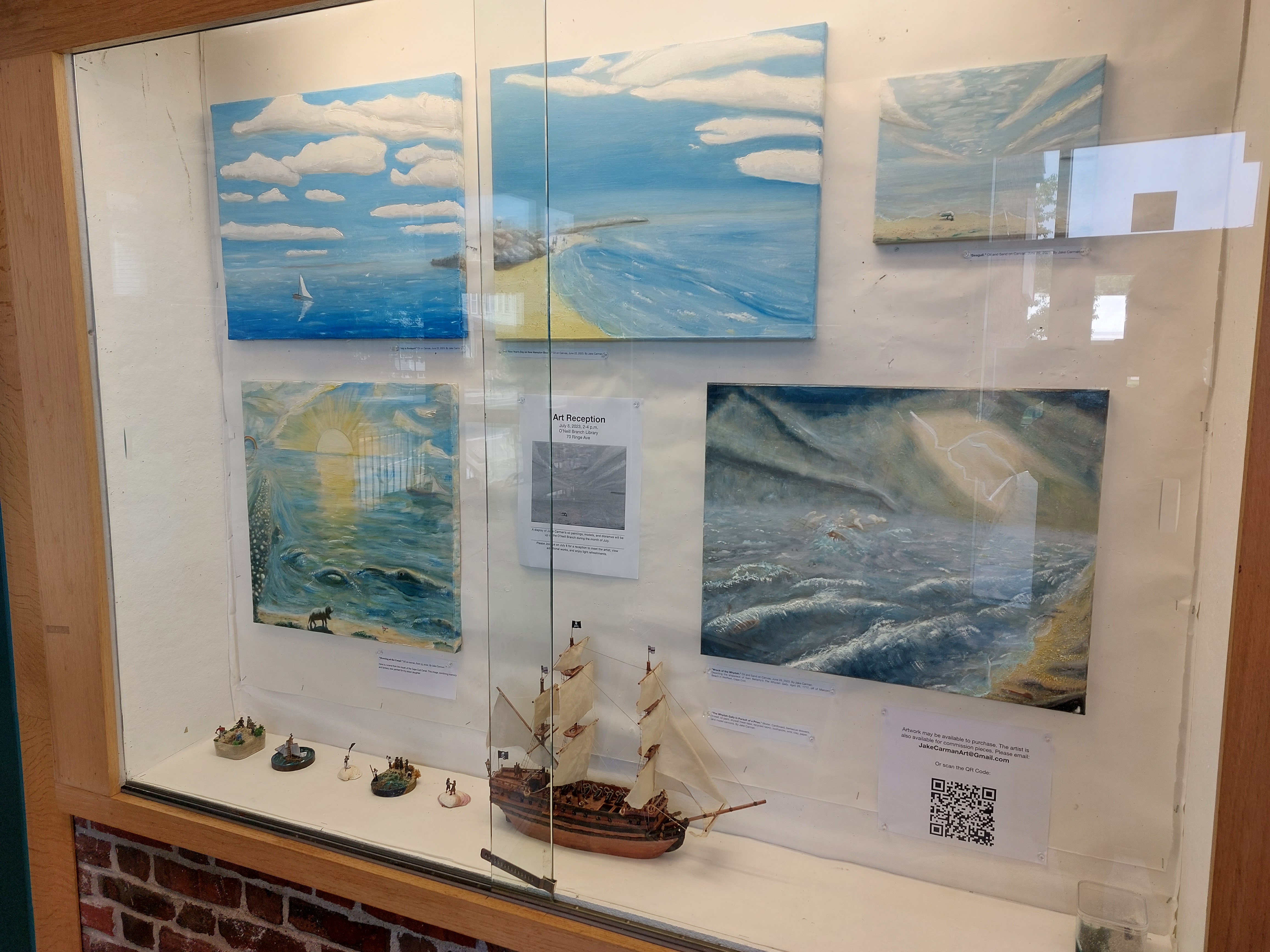 I can’t believe I haven’t posted on this website for an entire year… but it is that time again. I have booked the gallery space at the local library branch for the month of July. My art will be in the front room all month. We will also be having a reception on July 8. I have 8 new paintings, a scale model of the Whydah Gally, and more to share.