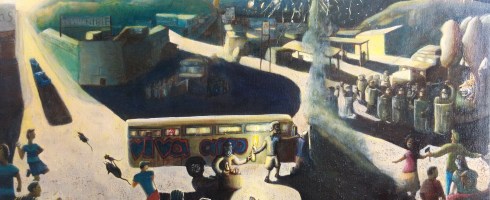 To celebrate the tenth anniversary of the Oaxaca Rebellion of June 14, 2006, I’d like to share a new painting, “La Última Barricada: Lxs compañerxs en la barricada de Cinco Señores.” The painting – made with oil and sand on canvas – depicts the opening moments of the November 2, 2006 battle for the Cinco Señores intersection in Oaxaca city. After five months of rebellion, the Federal Preventative Police (PFP) had invaded Oaxaca City to put down the uprising block by block. The morning of November 2nd, the PFP approached the barricade guarding the important rebel-held Radio Universidad. But the defenders at the barricades stood strong, and thousands more came to fight and defeat the police in an hours-long running battle. You can read more about the historic context below, in passages from my book, “Nine Years of Anarchist Agitation: The History of the Boston Anti-Authoritarian Movement and other Essays.”